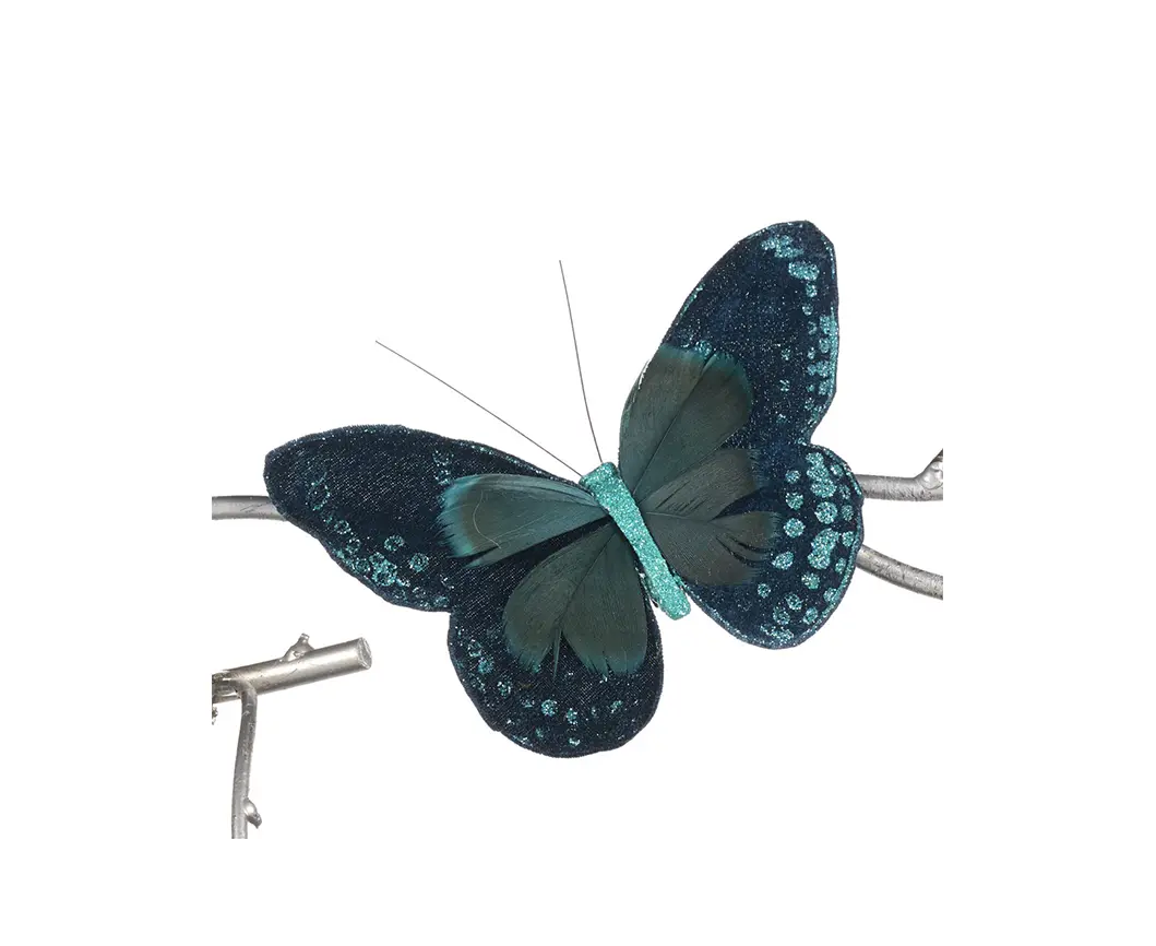 საახალწლო დეკორაცია პეპელა FABR PLUME BUTTERFLY ON CLIP BLU GRN 16სმ