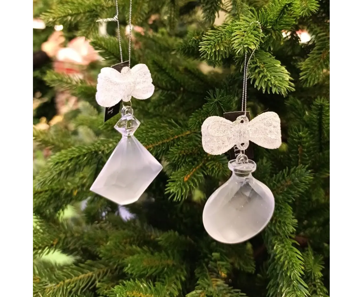 ეს ელეგანტური ნაძვის ხის სათამაშო გამჭვირვალე და თეთრი ელემენტებით თქვენს დღესასწაულის დეკორს ნაზ ბრწყინვალებასა და თანამედროვეობის შეხებას შემატებს. კრისტალისებური ფორმა მსუბუქად ირეკლავს განათებას, ხოლო თეთრი ბაფთა ვიზუალს უფრო დახვეწილსა და სადღესასწაულოს აქცევს. იდეალურია როგორც ნაძვის ხისთვის, ასევე გირლანდებისთვის, დეკორატიული კომპოზიციებისთვის და თაროების გასაფორმებლად.
