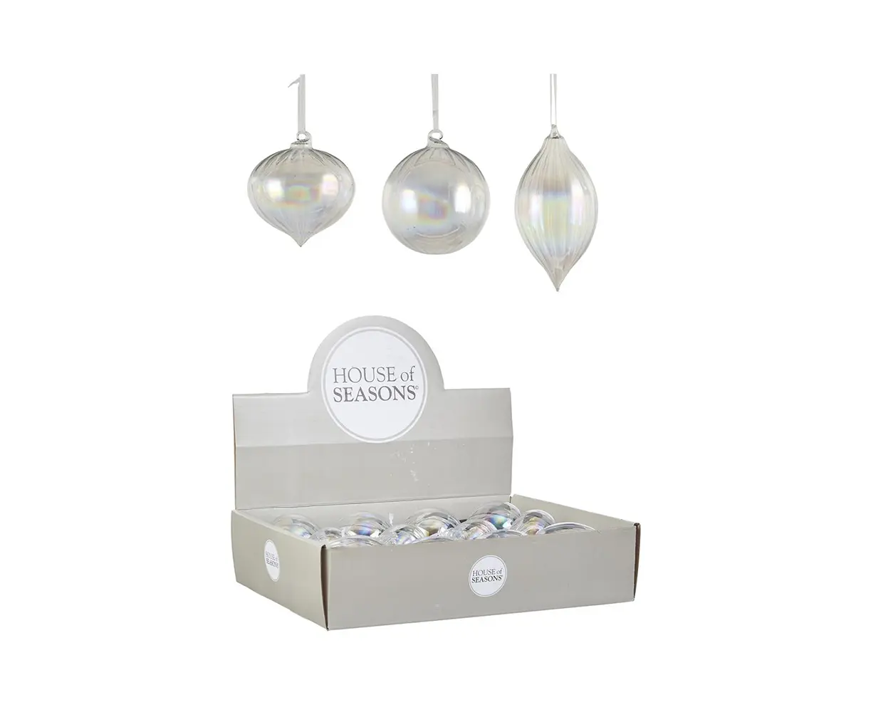 გამჭვირვალე მინისგან დამზადებული ნაძვის სათამაშოს უნივერსალური დიზაინი საშუალებას მოგცემთ შეუხამოთ იგი სხვა საახალწლო დეკორაციებს და შექმნათ უნიკალური ატმოსფერო. მისი ნაზი მარგალიტისფერი ბზინვარება ქმნის მოციმციმე ეფექტს, ხოლო კლასიკური ფორმა – ელეგანტურ დეკორს. პროდუქტი ხელმისაწვდომია სამ განსხვავებულ დიზაინში.