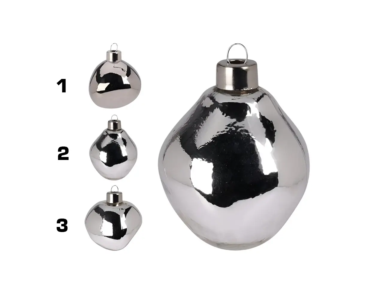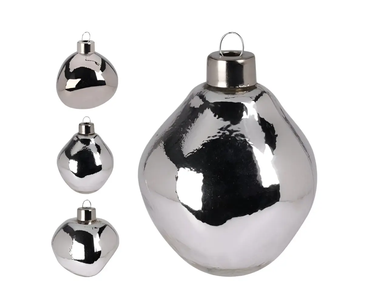 ვერცხლისფერი შუშის საახალწლო ბურთი თავისი უნიკალური ფორმით იდეალურად შეეფერება თანამედროვე მინიმალისტურ ინტერიერს, ასევე კარგად შეავსებს ვინტაჟურ ან გლამურულ სტილს. პროდუქტი ხელმისაწვდომია სხვადასხვა ფორმის.