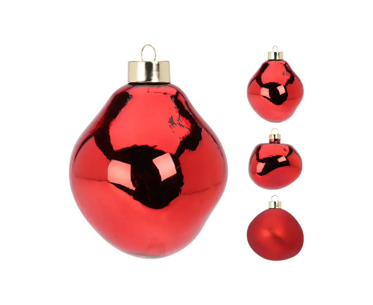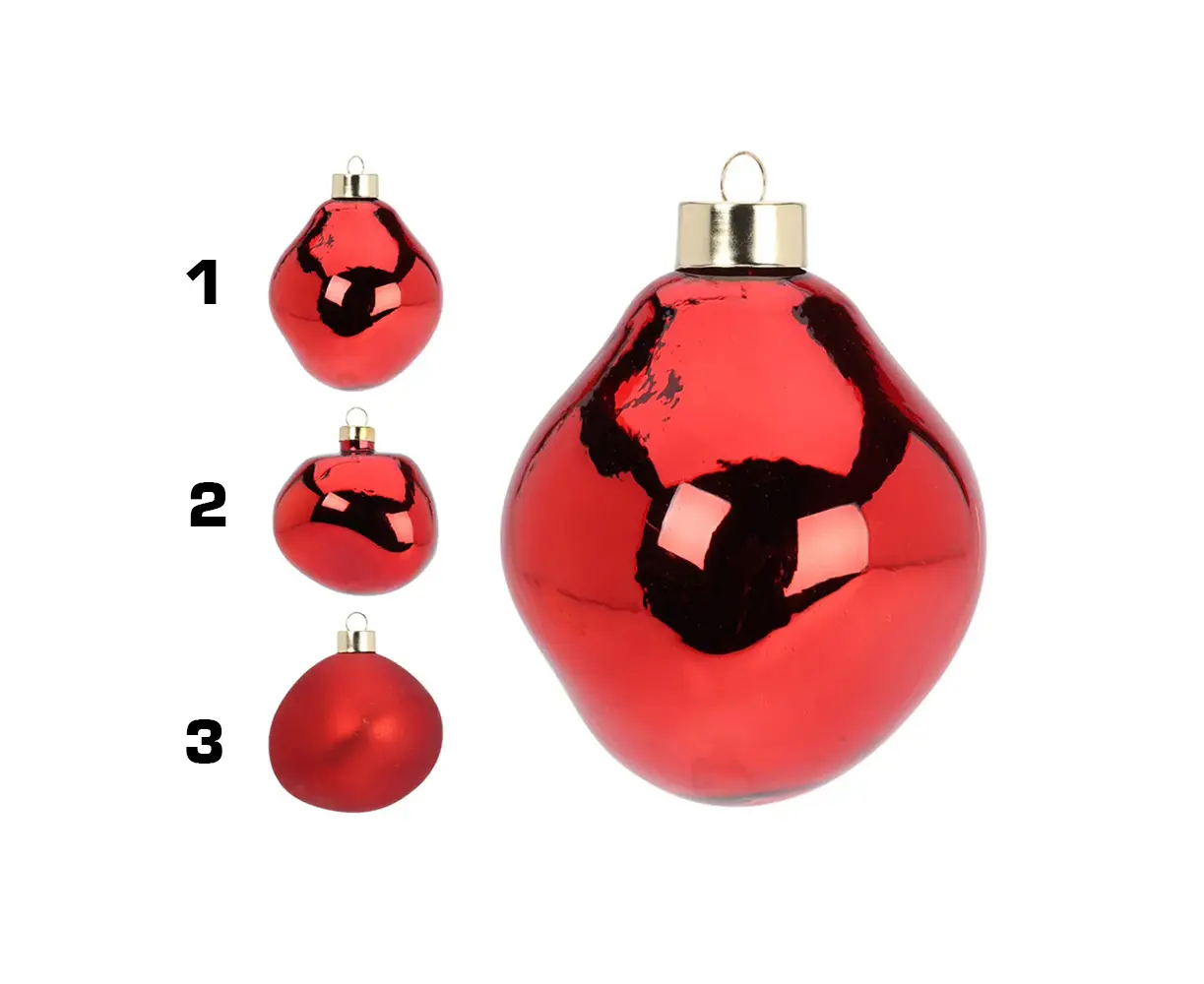 წითელი ფერის შუშის საახალწლო ბურთი თავისი უნიკალური ფორმით იდეალურად შეეფერება თანამედროვე მინიმალისტურ ინტერიერს, ასევე კარგად შეავსებს ვინტაჟურ ან გლამურულ სტილს. პროდუქტი ხელმისაწვდომია სხვადასხვა ფორმის.