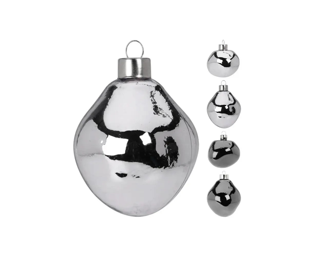 ვერცხლისფერი შუშის საახალწლო ბურთი თავისი უნიკალური ფორმით იდეალურად შეეფერება თანამედროვე მინიმალისტურ ინტერიერს, ასევე კარგად შეავსებს ვინტაჟურ ან გლამურულ სტილს. პროდუქტი ხელმისაწვდომია სხვადასხვა ფორმის.