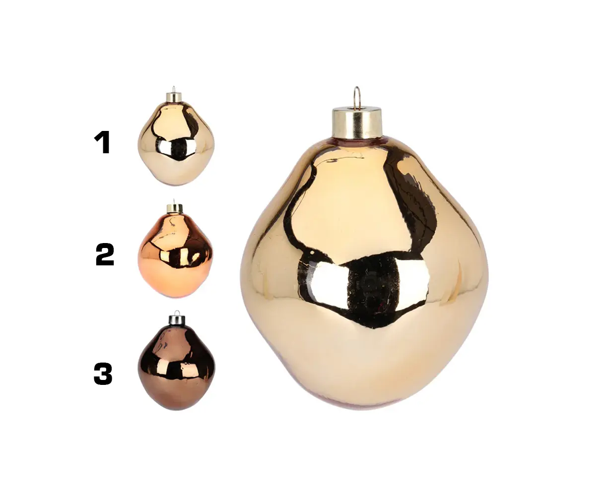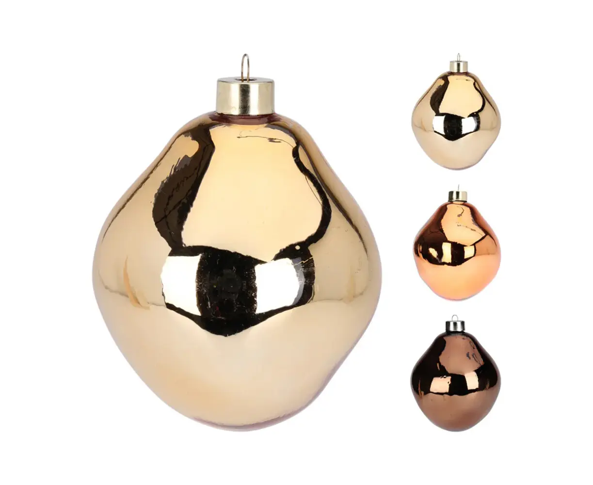 ოქროსფერი შუშის საახალწლო ბურთი თავისი უნიკალური ფორმით იდეალურად შეეფერება თანამედროვე მინიმალისტურ ინტერიერს, ასევე კარგად შეავსებს ვინტაჟურ ან გლამურულ სტილს. პროდუქტი ხელმისაწვდომია სხვადასხვა ფორმის.