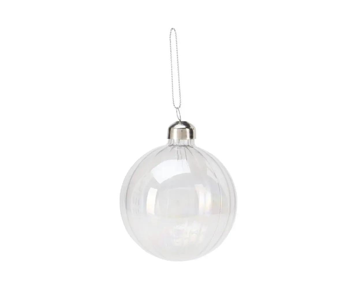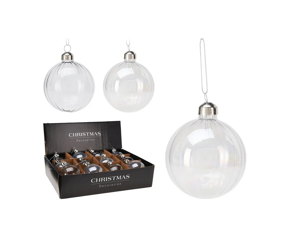 გამჭვირვალე შუშის ბურთი - მრავალმხრივი საახალწლო დეკორაციაა. მისი მარტივი დიზაინის დახმარებთ შეგიძლიათ შეუთავსოთ სხვა საახალწლო დეკორაციებს და შექმნათ უნიკალური ატმოსფერო. პროდუქტი ხელმისაწვდომია ორ განსხვავებულ ფერში.