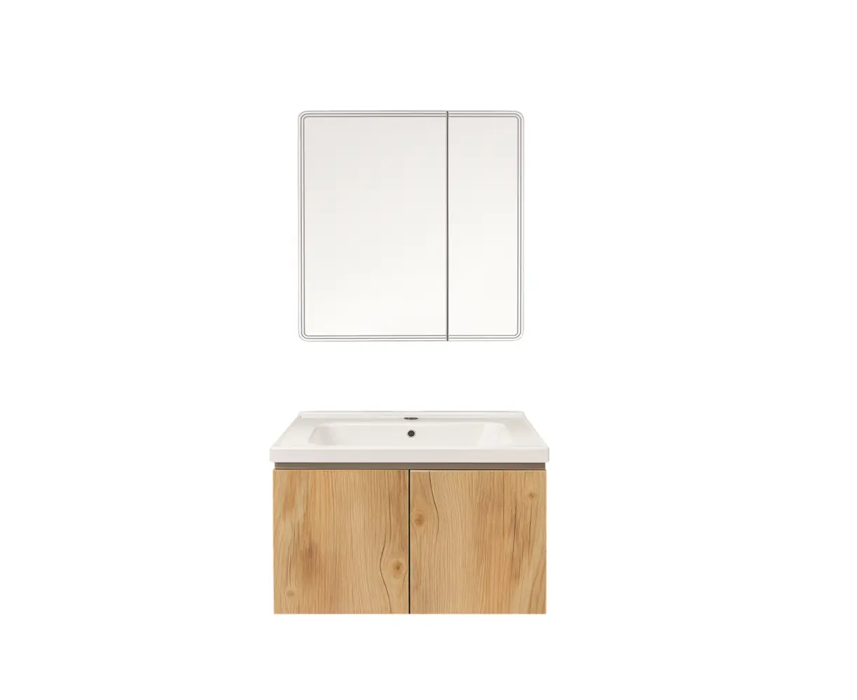 აბაზანის ავეჯი - თანამედროვე და პრაქტიკული გადაწყვეტა თქვენი აბაზანისთვის. კომპაქტური ზომის კარადა დამზადებულია ტენგამძლე PVC მასალისგან, რომელიც გამძლეა ტენისა და ტემპერატურის ცვლილებების მიმართ. თბილი „Light Wood“ ფერი ინტერიერს სძენს ბუნებრივ და დახვეწილ იერს. კომპლექტში შედის თანამედროვე LED განათებით აღჭურვილი სარკე, რომელიც უზრუნველყოფს კომფორტულ გამოყენებას და ანიჭებს სივრცეს ელეგანტურობას. დაკიდების სისტემა ამარტივებს მონტაჟს და სივრცის ეკონომიას უზრუნველყოფს.