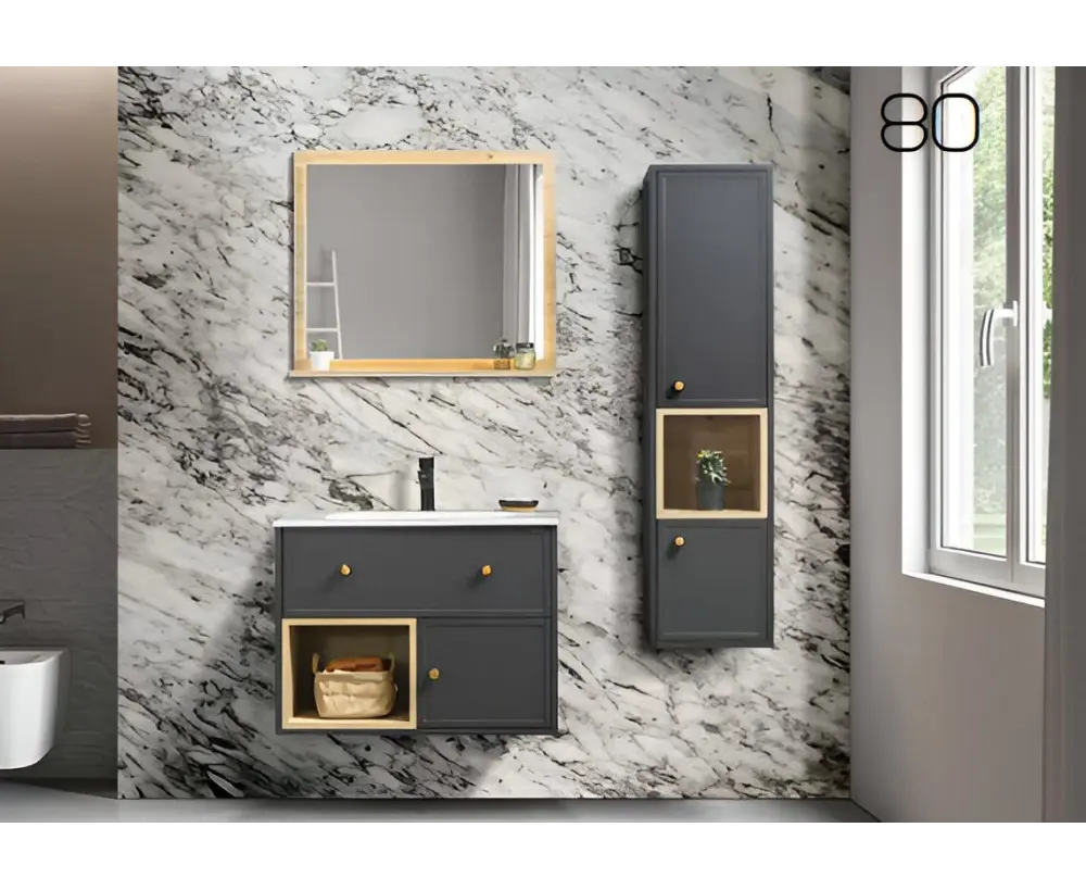 Martat Valeria 80-ის სააბაზანო სარკე ანტრაციტის ფერში გთავაზობთ დახვეწილ და თანამედროვე დიზაინს. მისი ზომებია 800x700x100 მმ და სარკე აერთიანებს ფუნქციურობას და მუქ ელეგანტურ ტონს, რაც მას სტილურ ელემენტად აქცევს თანამედროვე სააბაზანოებისთვის.