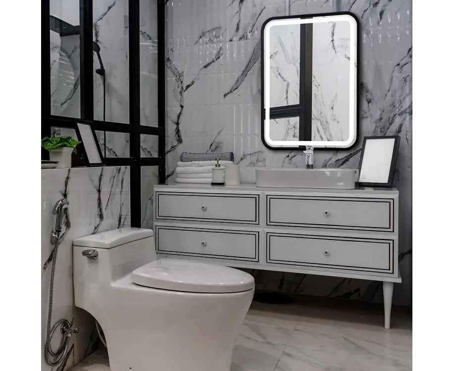 Loft სტილის სარკეები არის ლაკონური შავი პლასტმასის ჩარჩოს პრაქტიკული და თანამედროვე ინტერიერის დეკორი.