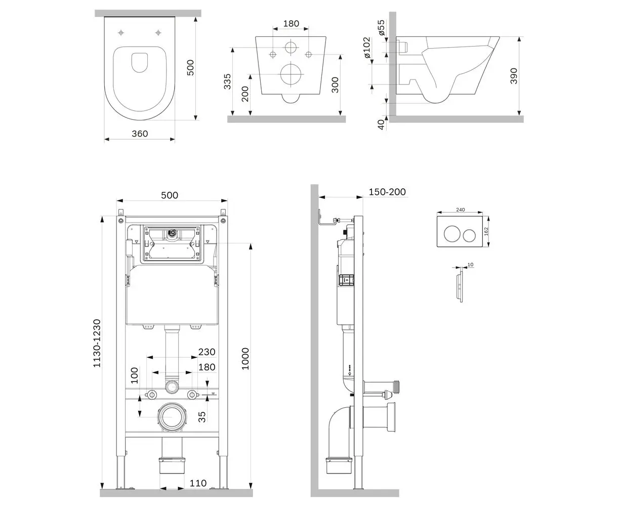 დამონტაჟებისთვის გამზადებული კომპლექტი მოიცავს ჩაშენებულ უნიტაზს ჩასარეცხი ღილაკის სისტემით და დაკიდულ უნიტაზს კომფორტული საფარით. კომპლექტში შედის სწრაფად მოსახსნელი დუროპლასტის საფარი Soft-Close ფუნქციით. ნაკაწრებისადმი გამძლე დუროპლასტის მასალა უჟანგავ ფოლადის სამაგრებთან ერთად უზრუნველყოფს მის საიმედოობასა და ხანგრძლივ გამოყენებას.