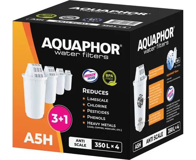 AQUAPHOR A5H ფილტრი სპეციალურად შექმნილია მყარი წყლის დარბილებისთვის და აქტიური მასშტაბის პრევენციისთვის. ის ასევე ამცირებს ქლორის შემაწუხებელ გემოს და სუნს, ფილტრავს ნალექს, კოლოიდურ რკინას, მძიმე მეტალებს (ტყვია და ა. AQUAPHOR A5H შეიცავს მეტ ფილტრაციის მედიას. მიკროფორის თავსახურთან ერთად, ფილტრი აჩვენებს გახანგრძლივებულ ფილტრს 350 ლიტრს. A5H ეფექტურად მუშაობს დაშლილი დამაბინძურებლების წინააღმდეგ წყალშიც კი, ჟანგის, ქვიშის ან სილის ხილული ნიშნებით.