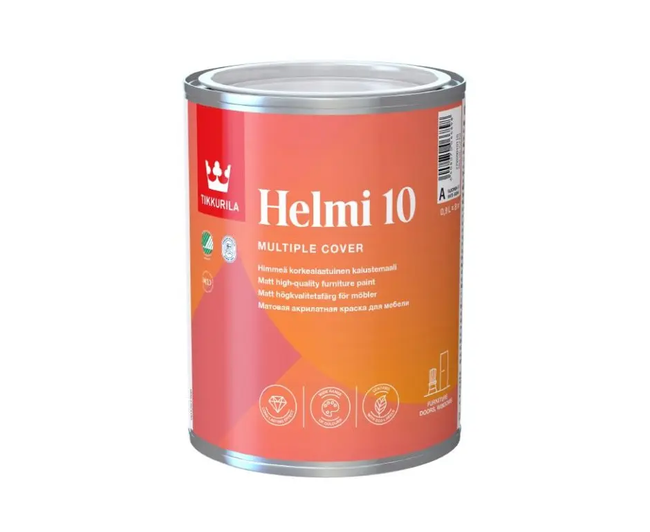 Tikkurila Helmi 10 Matt A 0.9 ლ – წყლის ბაზაზე დამზადებული, მქრქალი საღებავი, რომელიც იდეალურია შიდა მოხმარებისთვის, განსაკუთრებით ავეჯის, კარებისა და სხვა ხის ან მეტალის ზედაპირებისთვის.
