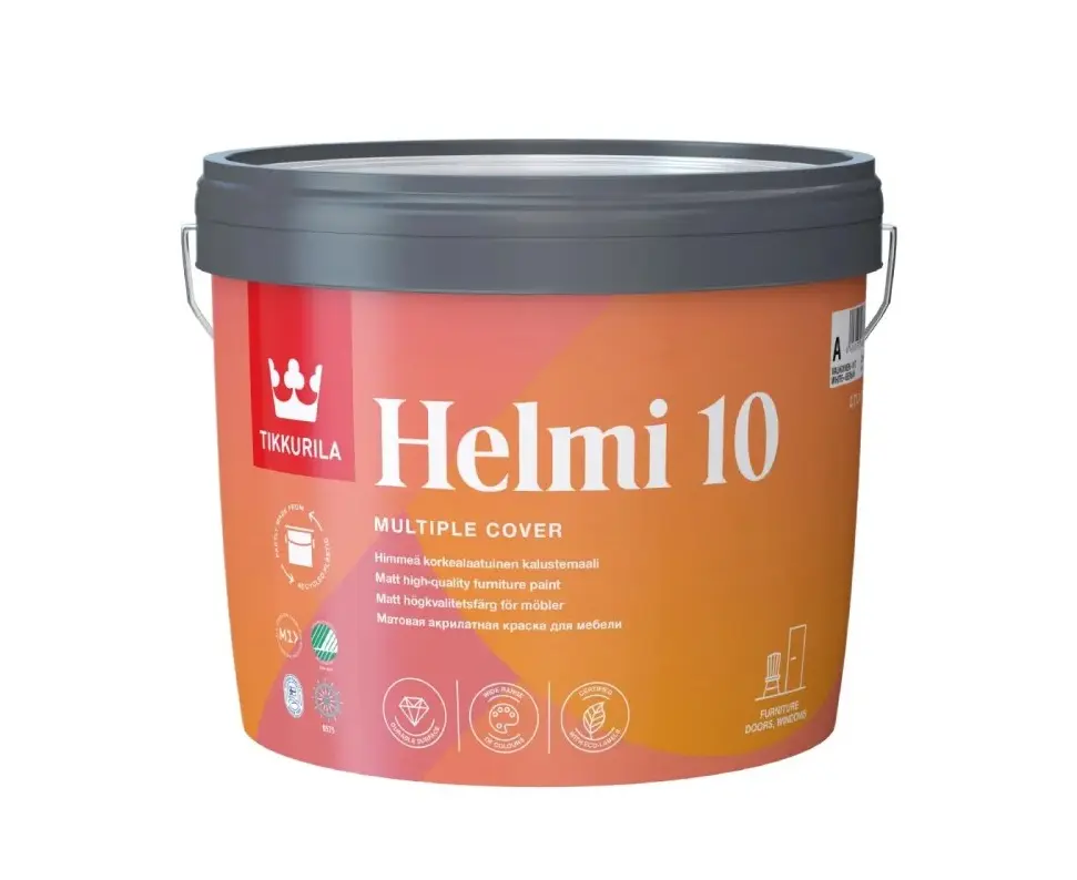 Tikkurila Helmi 10 Matt C 2.7 ლ – წყლის ბაზაზე დამზადებული, მქრქალი საღებავი, რომელიც იდეალურია შიდა მოხმარებისთვის, განსაკუთრებით ავეჯის, კარებისა და სხვა ხის ან მეტალის ზედაპირებისთვის.