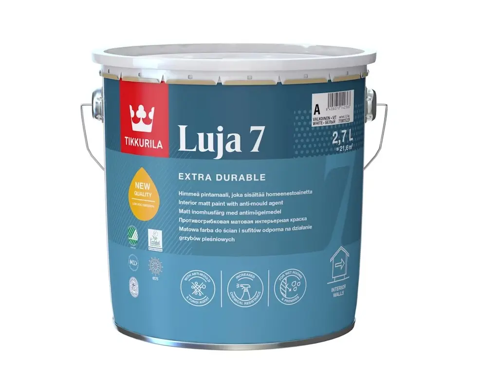 Tikkurila Luja 7 New C 2.7 ლიტრიანი ინტერიერის საღებავი წარმოადგენს მაღალი ხარისხის აკრილატულ საღებავს, რომელიც განკუთვნილია შიდა სამუშაოებისთვის, განსაკუთრებით სველ და მაღალი დატვირთვის მქონე სივრცეებში, როგორიცაა აბაზანები, სამზარეულოები, საავადმყოფოები და სხვა საზოგადოებრივი ადგილები.