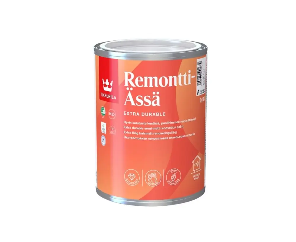 საღებავი Tikkurila Remontti-Ässä A 0,9 ლ არის ნახევრადმქრქალი, წყლის ბაზაზე დამზადებული საღებავი, რომელიც განკუთვნილია ინტერიერისთვის — განსაკუთრებით სველი სივრცეებისთვის, როგორიცაა აბაზანები და სამზარეულოები.