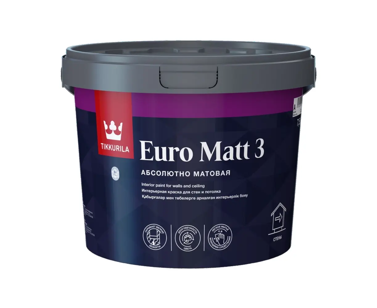 Tikkurila EURO MATT 3 - სანდო არჩევანი მქრქალი და ელეგანტური ინტერიერისთვის. ეს არის მაღალი ხარისხის, ეკოლოგიურად უსაფრთხო წყლის ბაზაზე დამზადებული საღებავი, რომელიც უზრუნველყოფს უნაკლო საფარს, გამძლეობას და მარტივ მოვლას.