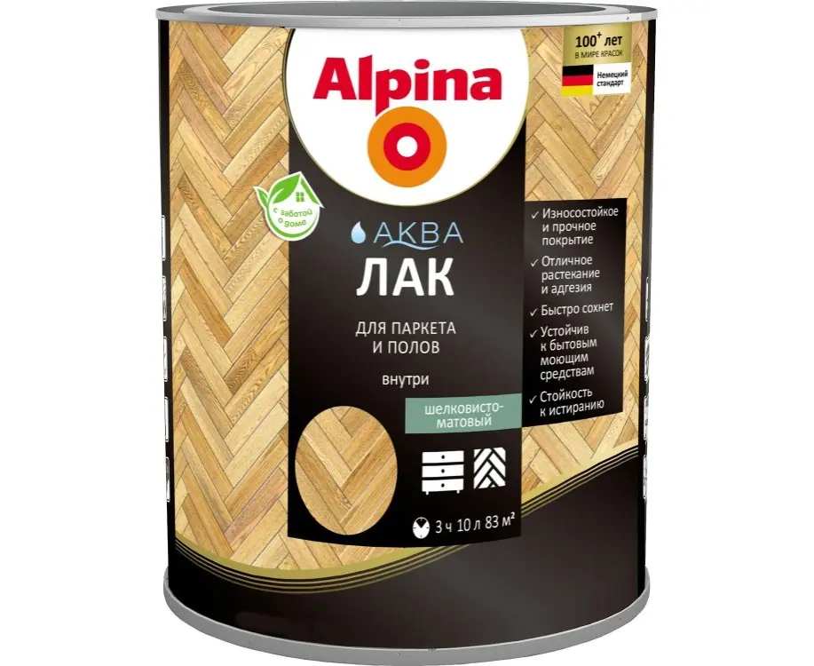 ლაქი აკრილის პარკეტისთვის და იატაკისთვის Alpina Aqua აბრეშუმისამებრ მქრქალი 10 ლ