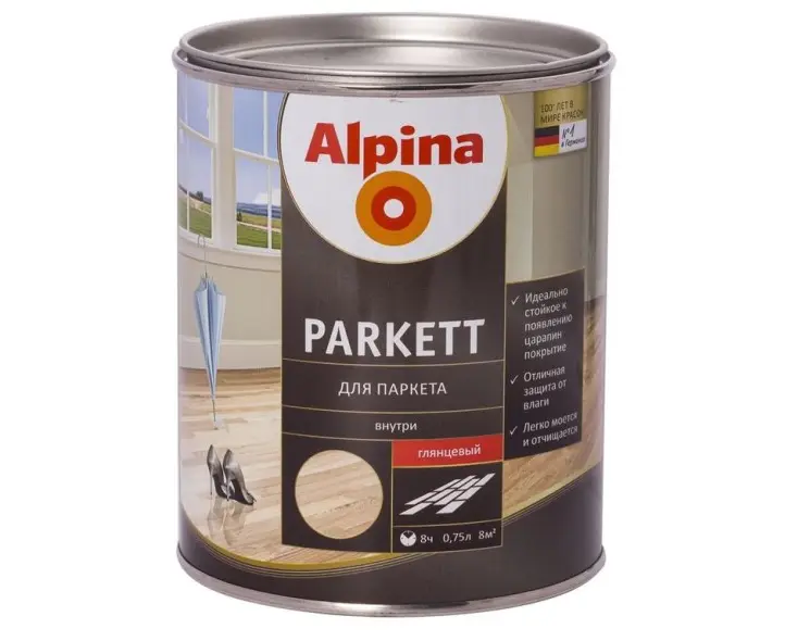 Alpina Parkett 537847 გამოიყენება ხის ზედაპირისთვის. მდგრადია ნაკაწრებისადმი.