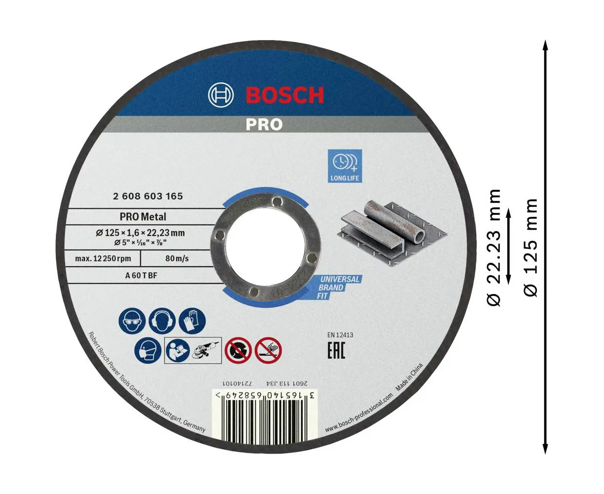Bosch 2608603165 Metal Standard საჭრელი დისკი არის მაღალი ხარისხის აქსესუარი, რომელიც განკუთვნილია ლითონის ზუსტი და ეფექტური ჭრისთვის. დისკოს დიამეტრი შეადგენს 125 მმ-ს, სისქე — 1.6 მმ, ხოლო ხვრელის დიამეტრი — 22.2/22.23 მმ. მაქსიმალური სამუშაო სიჩქარეა 12 250 ბრუნი/წთ, რაც უზრუნველყოფს გამძლეობას, უსაფრთხოებას და სიზუსტეს. იდეალური არჩევანია როგორც პროფესიონალური გამოყენებისთვის, ისე საოჯახო მეტალშემკეთებელი სამუშაოებისთვის.