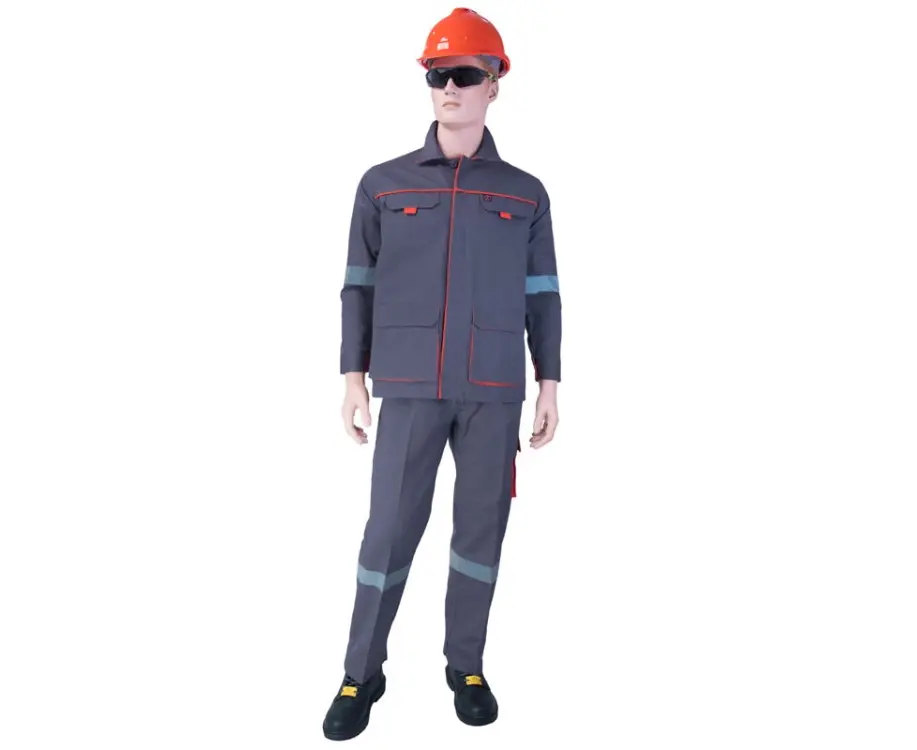 100%-იანი ბამბის ქსოვილისგან დამზადებული სამუშაო კოსტუმის კომლექტი. 2 გვერდითა და 2 სამკერდე ჯიბით.