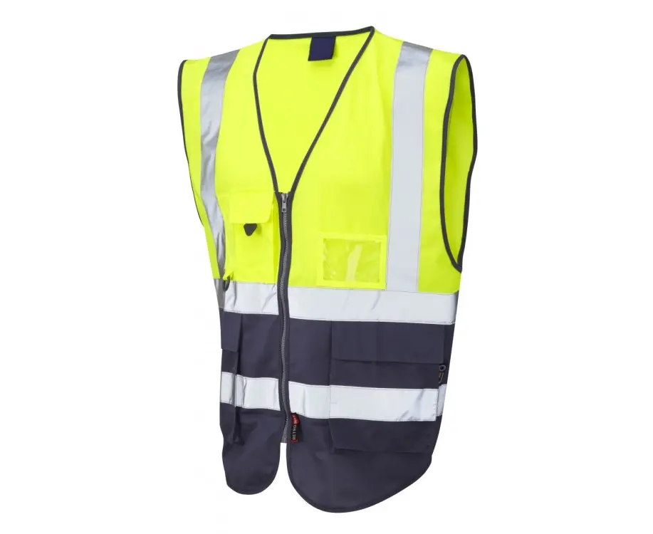 სასიგნალო ჟილეტი ჯიბეებით და ამრეკლი ხაზებით, უზრუნველყოფს ადამიანის ხილვადობას არასაკმარისი განათების პირობებში.