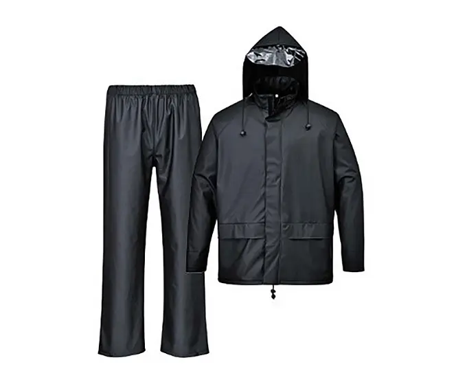 წყალგაუმტარი ლურჯი ფერის საწვიმარი-კომპლექტი, ქურთუკს გააჩნია კაპიუშონი და ორი ჯიბე, ასევე დამალული ელვა შესაკრავი. შარვალს გააჩნია ელასტიური ჩანართი წელის არეში.