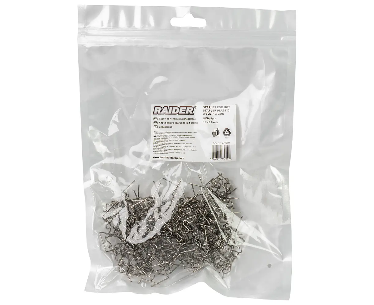 პლასტმასის შესაკეთებელი ლითონის კლიპები Raider 076209 (200 ც) განკუთვნილია სარჩილავის ტიპის შედუღების აპარატებისთვის. გამძლე მასალისგან დამზადებული კლიპები ამაგრებს დაზიანებულ ან დაბზარულ პლასტმასს. იდეალურია მანქანის, საყოფაცხოვრებო ტექნიკისა და ზოგადი შეკეთებისთვის.