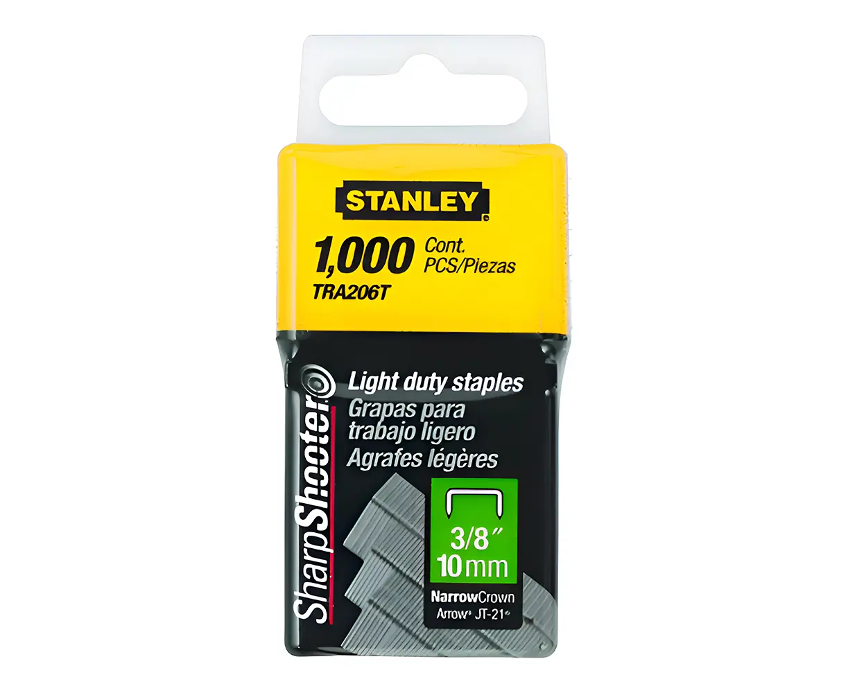 Stanley TRA206T სტეპლერის ტყვიები განკუთვნილია სტეპლერებისთვის და მათი ზომაა 10 მმ (3/8"). კომპლექტი შეიცავს 1000 ცალს.