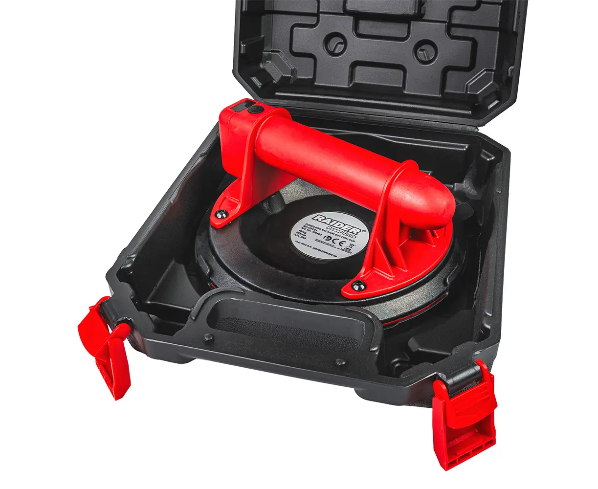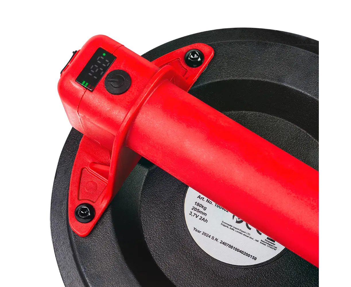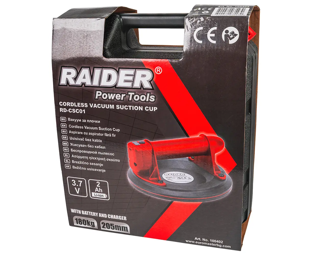 Raider RD-CSC01-ის აკუმულატორის ვაკუუმური დგუში (3.7V, Ø205 მმ) უზრუნველყოფს მტკიცე და საიმედო მიმაგრებას ზედაპირზე. მაქსიმალური ტვირთამწეობა 180 კგ, შესაფერისია მინის, კერამიკის და მსგავსი მასალების ასაწევად ან დასამონტაჟებლად.