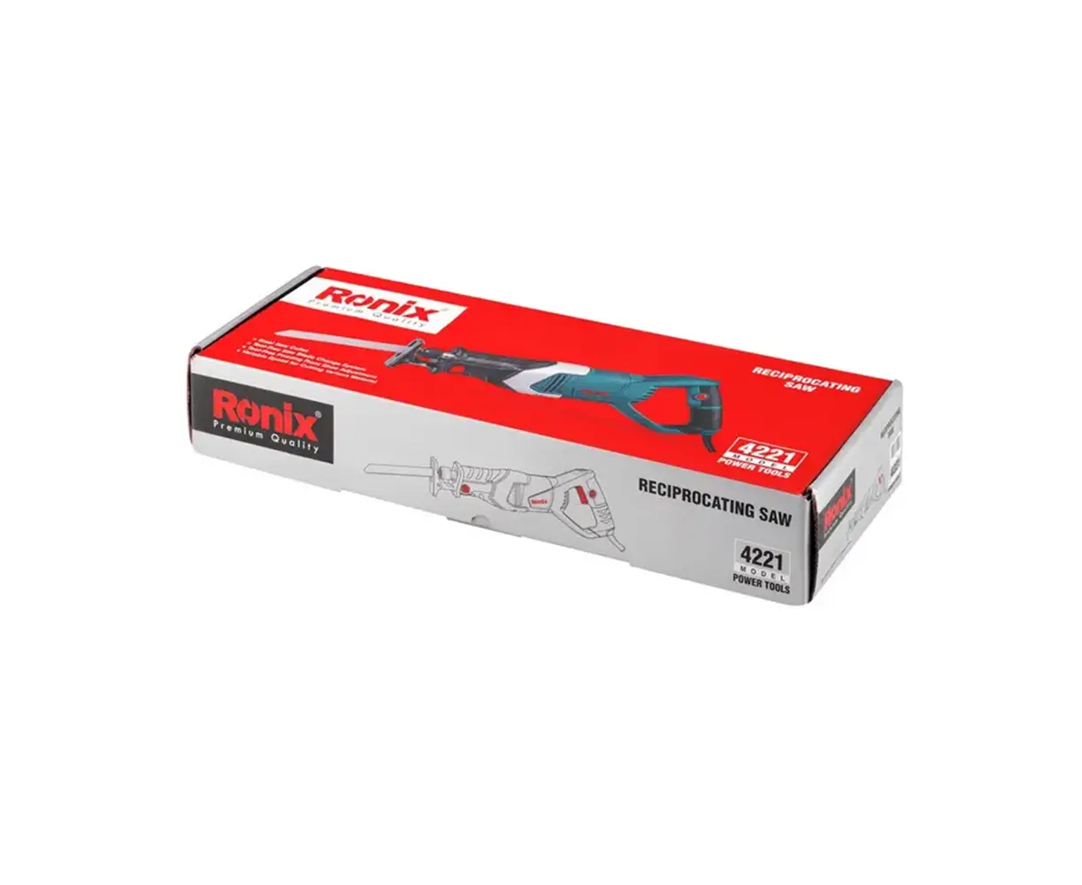 ელექტრო ხმლისებრი ხერხი Ronix 4221 არის ერთ-ერთი ყველაზე ძლიერი და მაღალი ხარისხის საჭრელი ინსტრუმენტი ამ ბრენდისგან. მისი 705 ვატიანი ძრავი აღჭურვილია სრულად ავტომატური მექანიზმებით. ეს ელექტრო ხერხი ასრულებს ჰორიზონტალურ ჭრებს დანის წინ-უკან მოძრაობით. ინსტრუმენტის გარეშე დანა სწრაფად შესაცვლელი მექანიზმი და ჭრის სიღრმის რეგულირების შესაძლებლობა ამ პროდუქტის დამატებითი უპირატესობებია.
