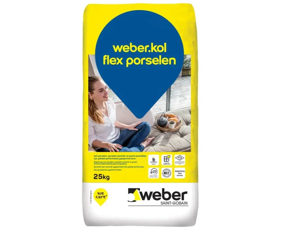 Weber.kol flex porselen არის მაღალწარმოებადი, ეკოლოგიური და ელასტიური მინარევი ცემენტის საფუძველზე, შემცირებული მოცურებით. დატანების სისქე 3-10 მმ.