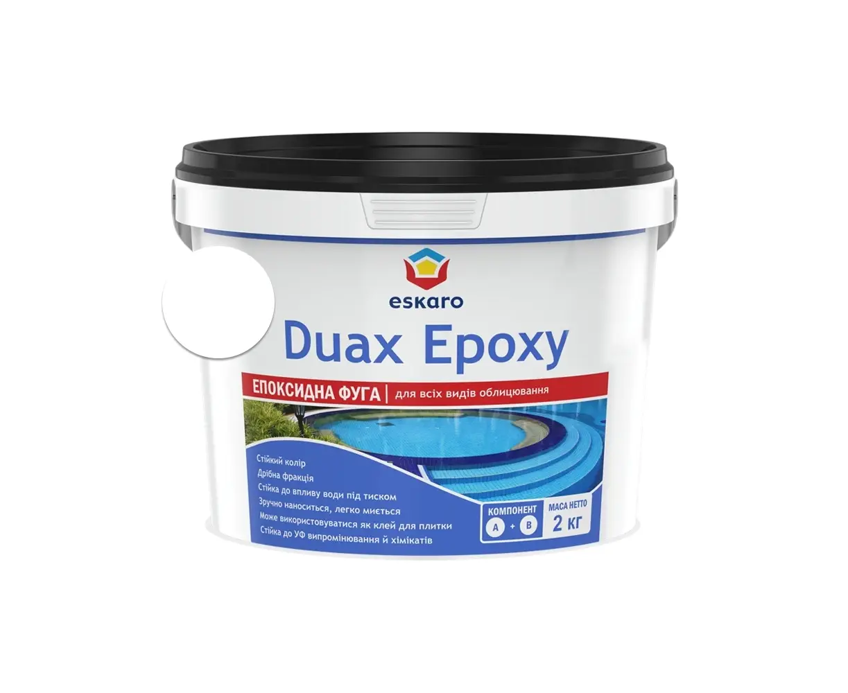 Eskaro Duax Epoxy არის ორკომპონენტიანი ეპოქსიდური შემავსებელი, მაღალი სიმტკიცის, სრულიად წყალგაუმტარი, მდგრადია ქიმიკატებისა და ბაქტერიების, ულტრაიისფერი გამოსხივების, დაბალი და მაღალი ტემპერატუროს, ცვეთის მიმართ, ადვილია დასატანებლად და ჩამოსარეცხად, მკვრივდება შეკუმშვის გარეშე. შეიძლება გამოყენებულ იქნას როგორც ფილების წებო.
