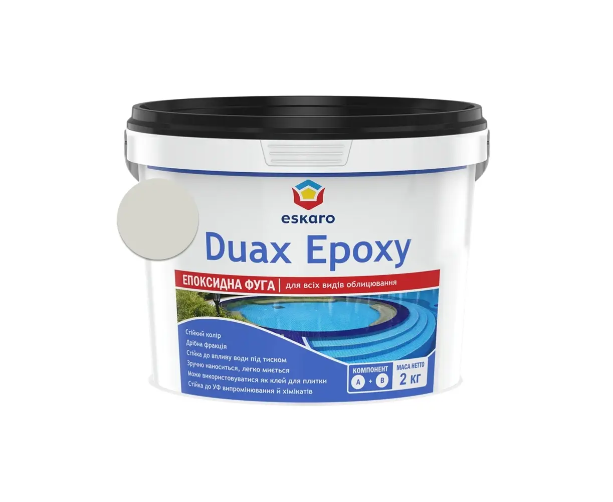 Eskaro Duax Epoxy არის ორკომპონენტიანი ეპოქსიდური შემავსებელი, მაღალი სიმტკიცის, სრულიად წყალგაუმტარი, მდგრადია ქიმიკატებისა და ბაქტერიების, ულტრაიისფერი გამოსხივების, დაბალი და მაღალი ტემპერატუროს, ცვეთის მიმართ, ადვილია დასატანებლად და ჩამოსარეცხად, მკვრივდება შეკუმშვის გარეშე. შეიძლება გამოყენებულ იქნას როგორც ფილების წებო.