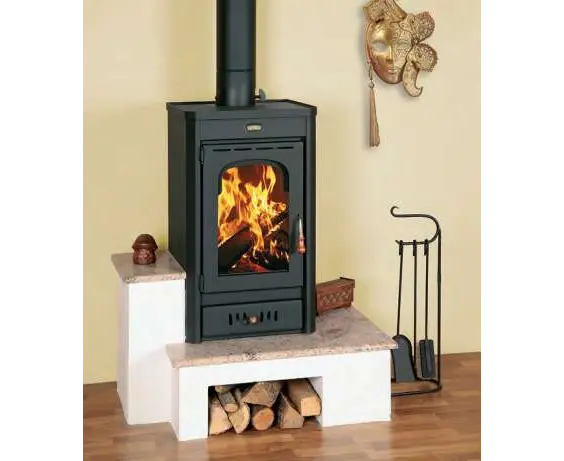 ელეგანტური ბუხარი-ღუმელი შეშაზე, გადიდებული მინით SR მოდელის საფუძველზე, დეკორატიული ელემენტებით.