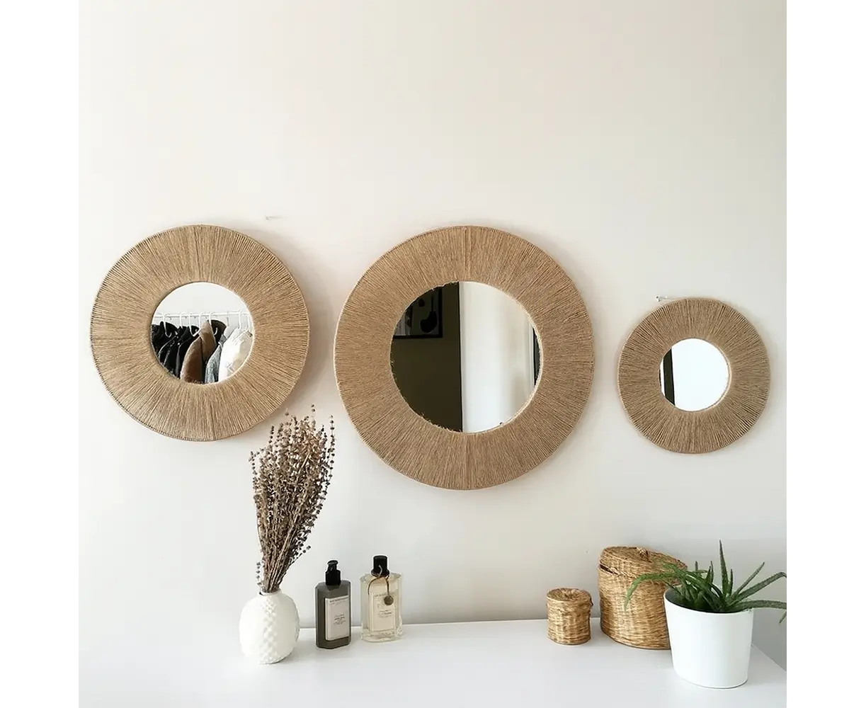 ეს უნიკალური, ხელნაკეთი დეკორატიული სარკე იდეალურად ერწყმის ბოჰემურ სტილს. მისი ბუნებრივი ჯუთის ტექსტურა და რბილი, მრგვალი ფორმა თვალშისაცემი ელეგანტურობით ამდიდრებს კედელს და აქცევს მას თვალსაჩინო არტ-ობიექტად. იდეალურია როგორც საძინებლისთვის, ისე მისაღები ოთახისთვის — ნებისმიერი სივრცე მასთან ერთად ხდება უფრო მყუდრო, დახვეწილი და შთაგონებული. ეს არის შესანიშნავი საჩუქარი მათთვის, ვინც აფასებს ბუნებრივ მასალებს, გემოვნებიან დიზაინს და ხელნაკეთი ნივთების ავთენტურ ხიბლს.