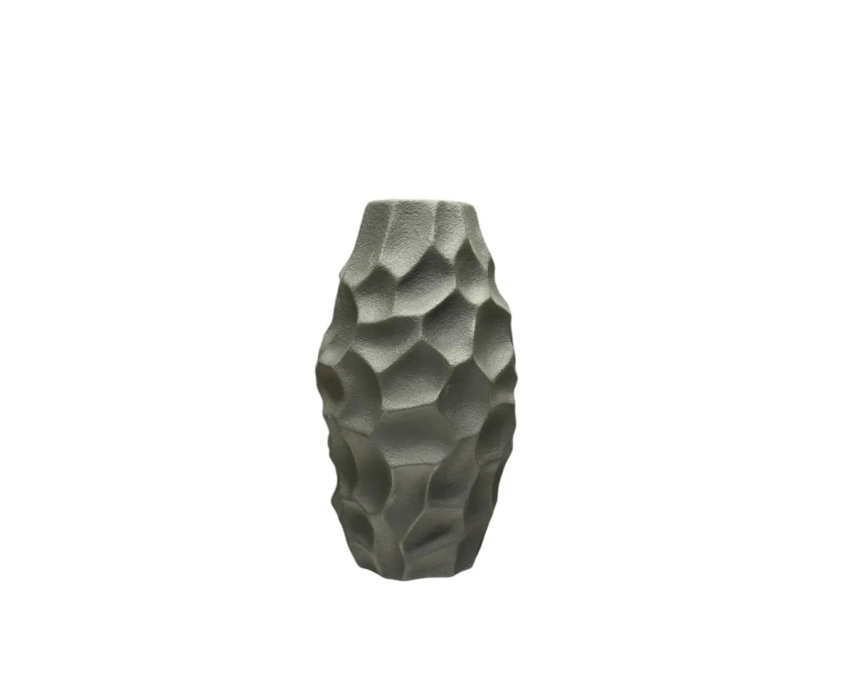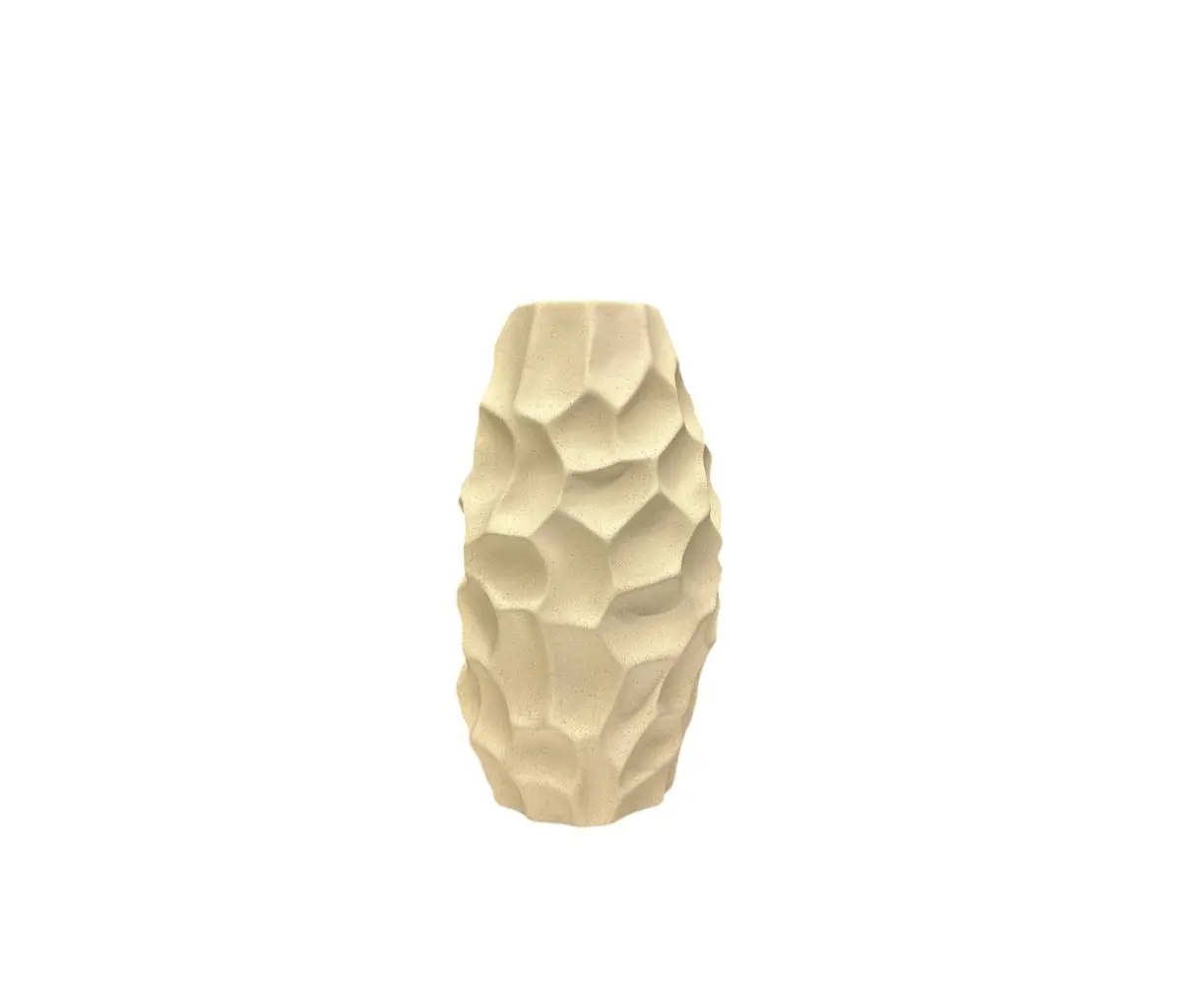 ეს თანამედროვე კერამიკული ლარნაკი გამოირჩევა უნიკალური, ქვის ტექსტურითა და გეომეტრიული ფორმებით, რომლებიც სივრცეს მატებს ორიგინალურობას და თანამედროვე ხასიათს. მის ზედაპირზე შექმნილი ტალღოვანი რელიეფი სინათლეს განსხვავებულად აირეკლავს, რაც მას განსაკუთრებულ ვიზუალურ ეფექტს ანიჭებს. იდეალურია როგორც დამოუკიდებელი დეკორი, ასევე მშრალი ყვავილებისა და დეკორატიული მცენარეებისთვის.