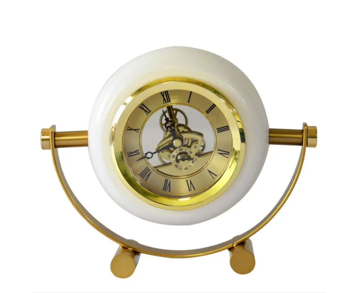 ეს ელეგანტური მაგიდის საათი გამოირჩევა დახვეწილი დიზაინითა და ულამაზესი დეტალებით. ოქროსფერი მექანიზმი და რეტრო სტილის რიმის ნიშნულები შერწყმულია თეთრ კორპუსთან, რაც საათს უნიკალურ იერს აძლევს. გამჭვირვალე მექანიკური სისტემა ინტერიერს ანიჭებს სიძველისა და თანამედროვეობის ჰარმონიას. იდეალური არჩევანია როგორც სახლის, ისე ოფისის დეკორაციისთვის.