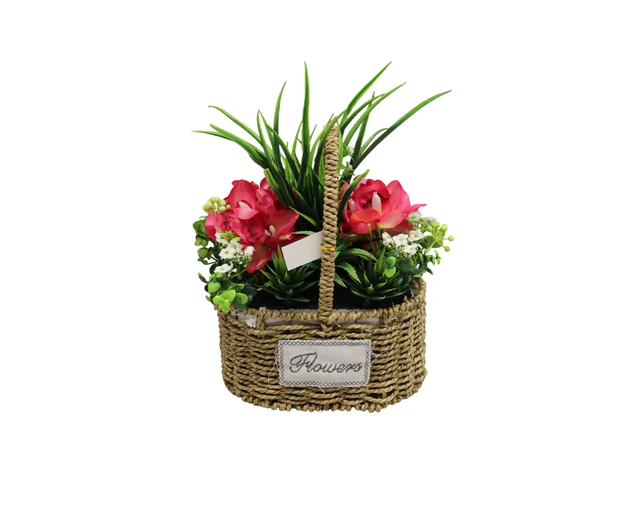 კალათის შიგნით ლამაზად არის მოთავსებული მრავალფეროვანი ხელოვნური ყვავილები და მწვანე მცენარეების ჩანართები. კომპოზიციის საფუძველს ქმნის ღია ვარდისფერ-წითელი კვირტები, რომლებიც გარშემორტყმულია ნაზი პატარა თეთრი ყვავილებით და ხშირი მწვანე ბალახით, რაც ახალი საგაზაფხულო სიმწვანის იმიტაციას ქმნის. ყვავილებისა და ფოთლების რეალიზმი მიღწეულია მაღალი ხარისხის მასალებისა და დეტალებისადმი ყურადღების წყალობით.