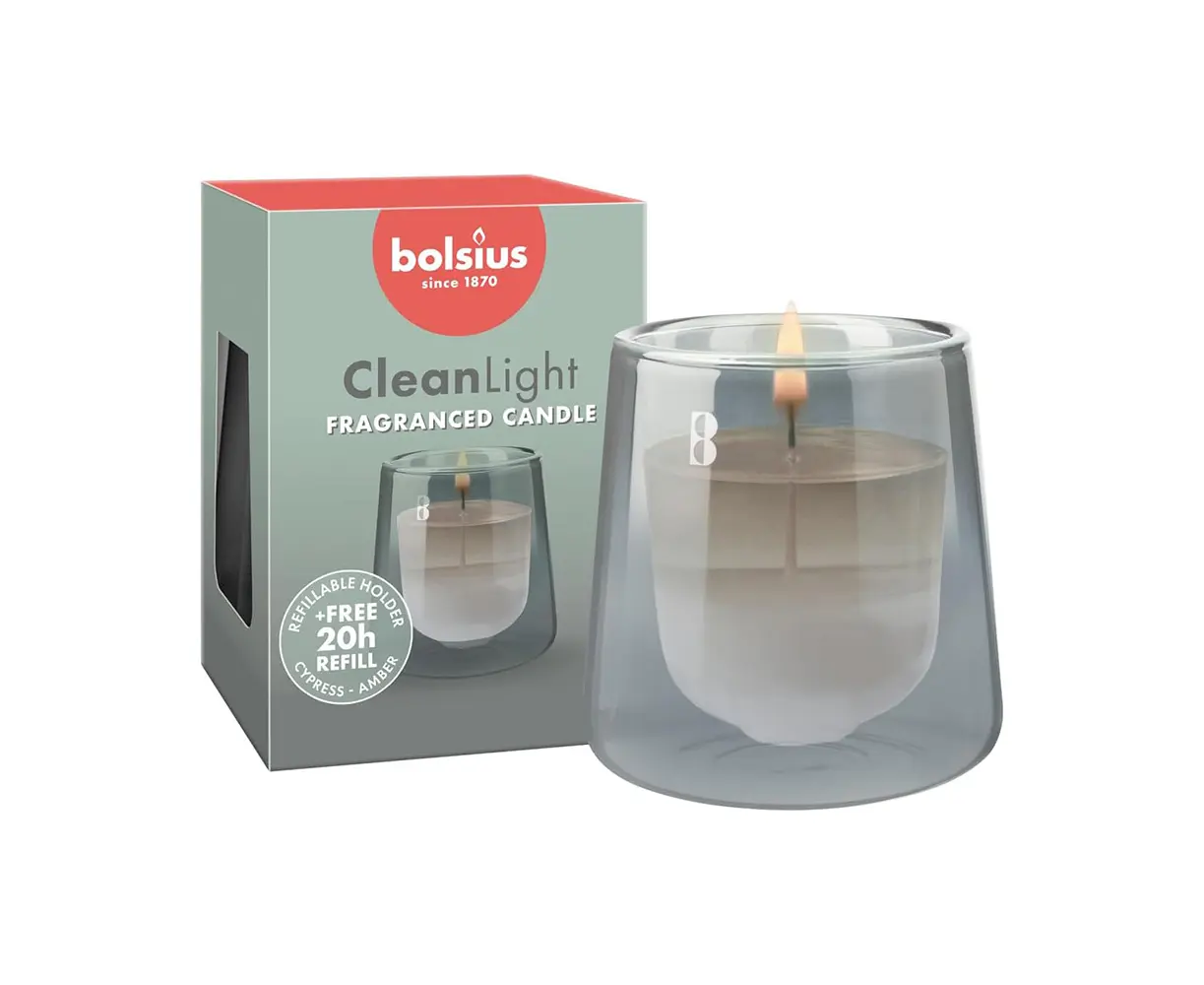 Bolsius CleanLight Starter Kit წარმოადგენს დახვეწილ და ეკოლოგიურად სუფთა არჩევანს არომათერაპიისა და ინტერიერის ატმოსფეროსთვის. ნაკრები მოიცავს ხელით დამზადებულ მინის სანთელდამჭერს და სურნელოვან სანთელს „Grey Cypress & Amber“. უნიკალური ScentMax ტექნოლოგია უზრუნველყოფს არომატის სამმაგად ინტენსიურ გამოთავისუფლებას 20 საათის განმავლობაში. სანთლის ამოწურვის შემდეგ, შეგიძლიათ მარტივად ჩაანაცვლოთ შიგთავსი ახალი არომატით — მინიმალური ნარჩენებითა და მაქსიმალური სიამოვნებით. დამზადებულია მცენარეული ცვილისგან, არ შეიცავს პალმის ზეთს. „Grey Cypress & Amber“ აერთიანებს ქარვის და კვიპაროსის ნაზ სურნელს და ქმნის მყუდრო ატმოსფეროს.