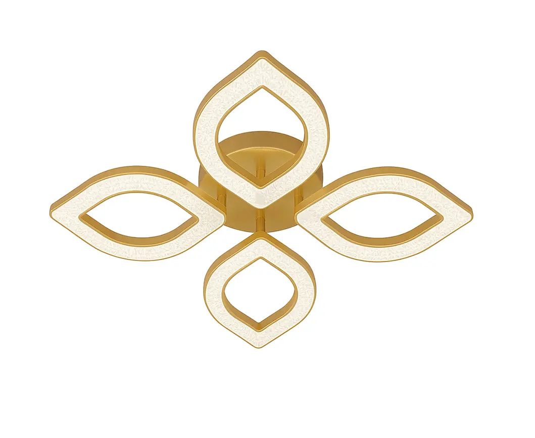 ელეგანტური სანათი გამოირჩევა ოთხი ფოთლის ფორმის LED ელემენტით, რომლებიც დახვეწილად მოთავსებულია ოქროსფერი პრიალა ჩარჩოზე. თეთრი, კრისტალური ტექსტურის მქონე განათების ზონები ქმნის თვალისმომჭრელ სინათლის ეფექტს და ზრდის სივრცის ვიზუალურ სიმდიდრეს. შესანიშნავი არჩევანია როგორც საცხოვრებელი, ისე კომერციული ინტერიერისთვის.