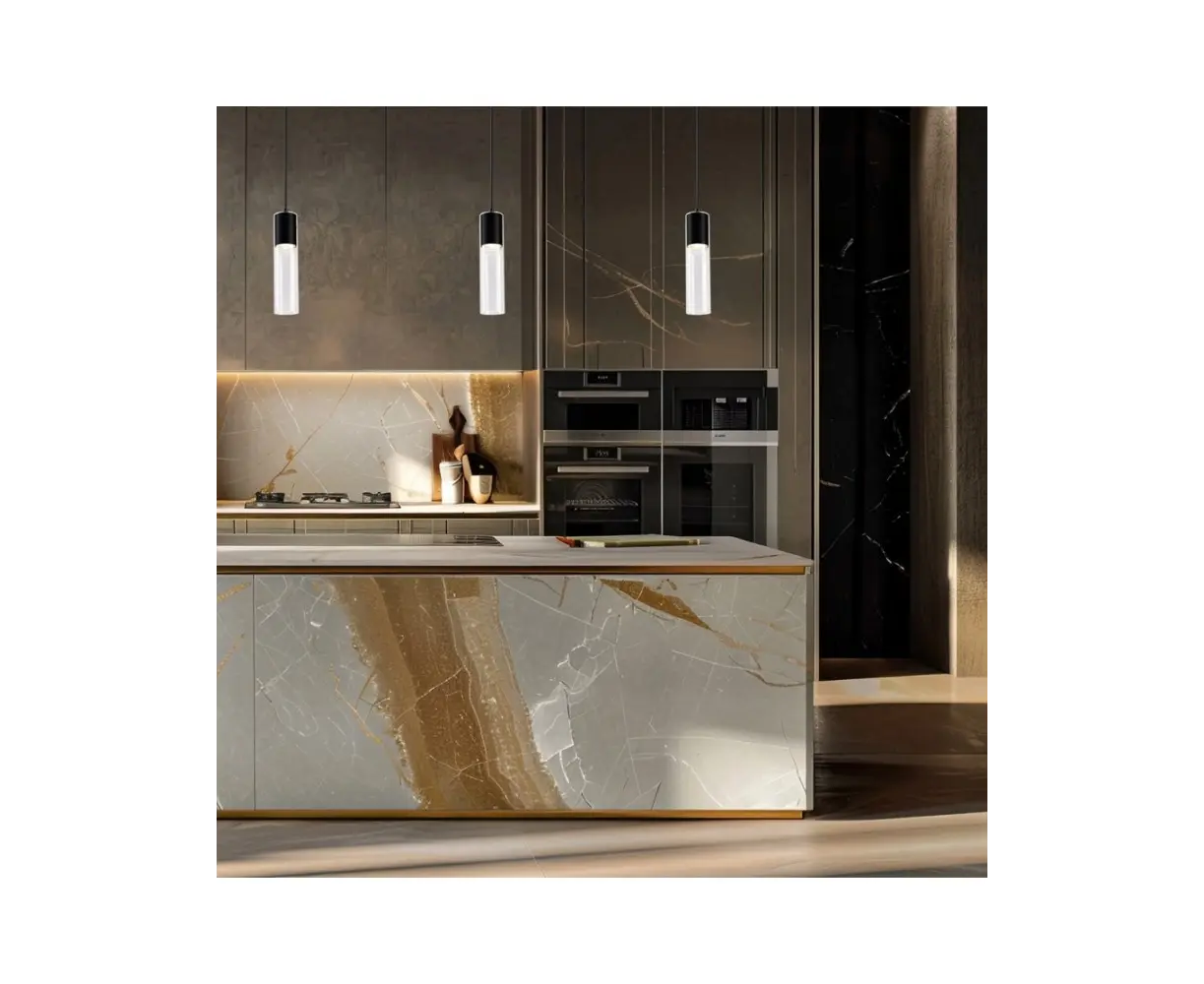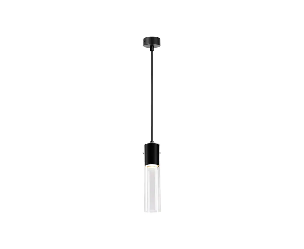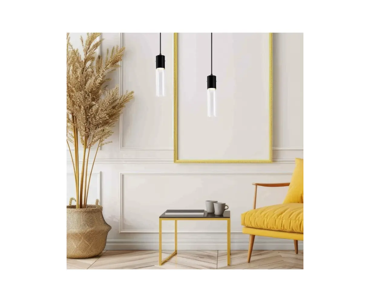 თანამედროვე და მინიმალისტური საკიდი დახვეწილი, ცილინდრული დიზაინით. შავი ლითონის ჩარჩო ლამაზად ეწინააღმდეგება გამჭვირვალე მინის ცილინდრს, ქმნის მარტივ, მაგრამ ელეგანტურ იერს. ინტეგრირებული LED განათება უზრუნველყოფს ნათელ, ენერგოეფექტურ განათებას, რაც ამ საკიდი განათებას აქცევს ნებისმიერი თანამედროვე სახლის ფუნქციურ და ელეგანტურ დანამატად.
