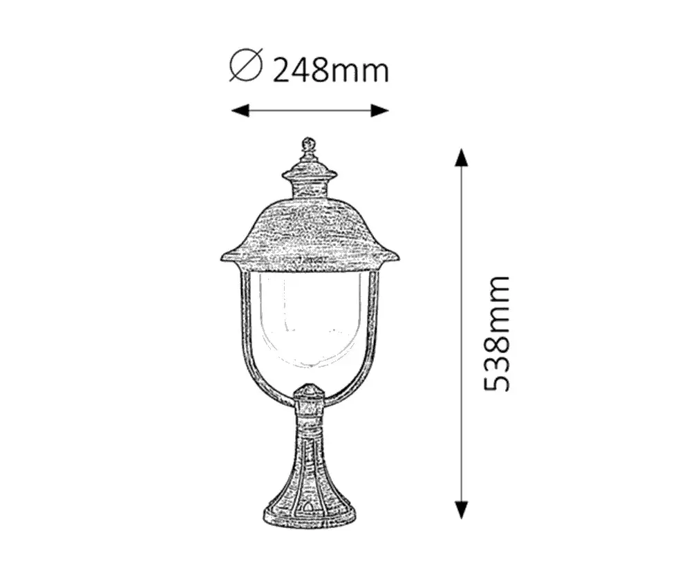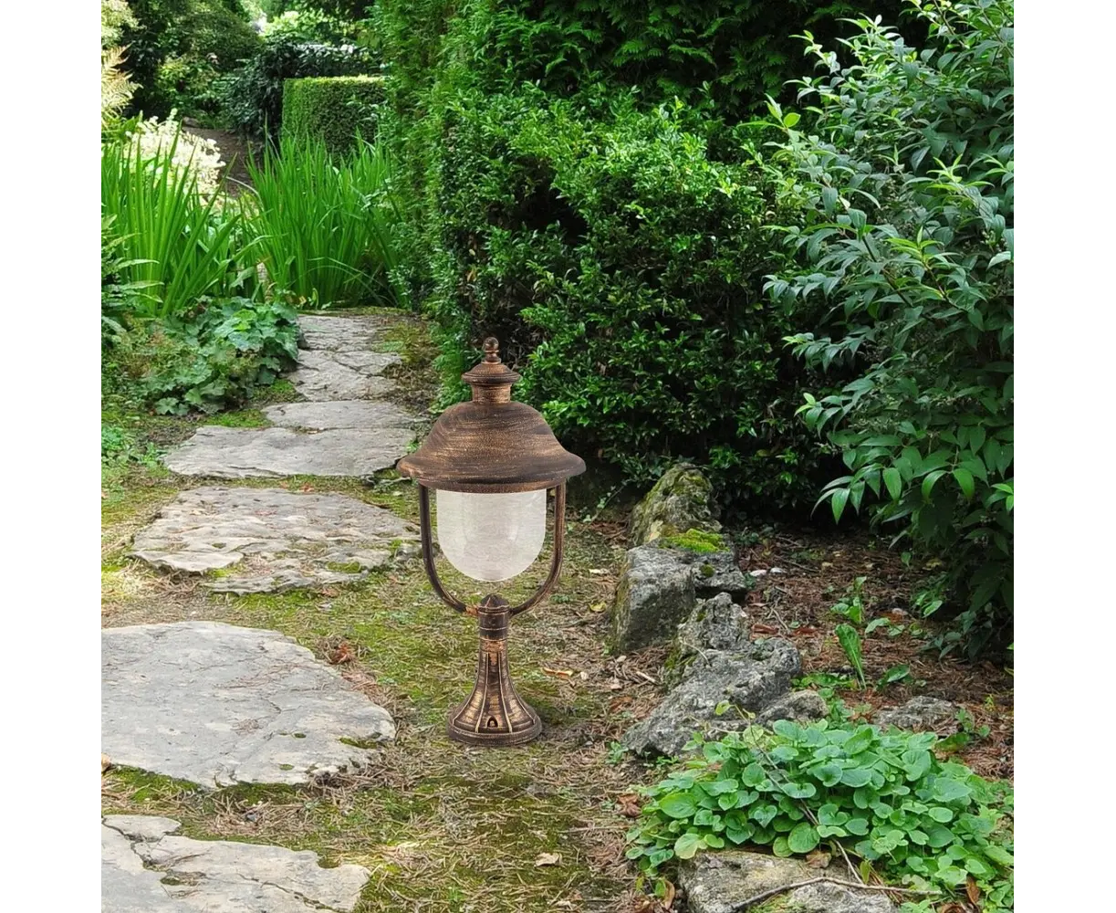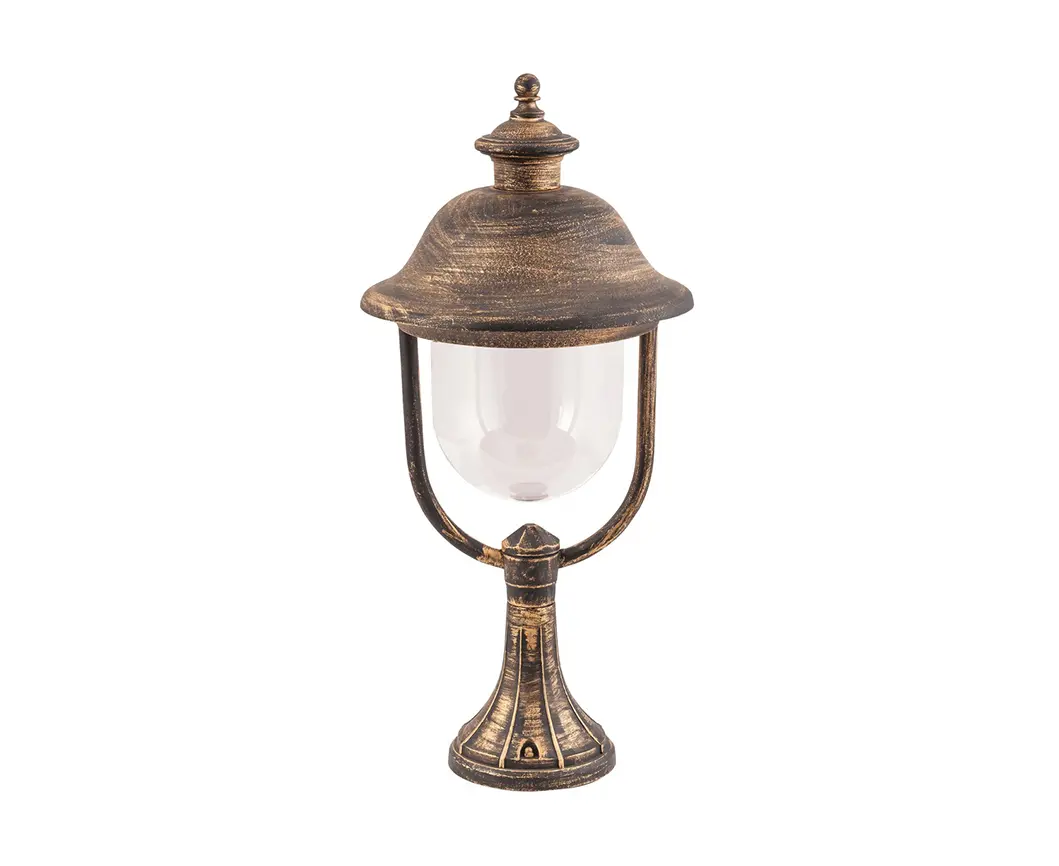 გარე სანათი კლასიკური იერით და 1 სოკეტით. 58,8 სმ სიმაღლის, 24,5 სმ დიამეტრის, ანტიკვარული ოქროსფერი ლითონის სანათი და პლასტმასის აბაჟური IP44 დაცვით წყლისა და მტვრისგან. სანათის გამოყენება შესაძლებელია 100 ვტ-მდე სიმძლავრის სინათლის წყაროსთან, ტიპის E27 სოკეტით.