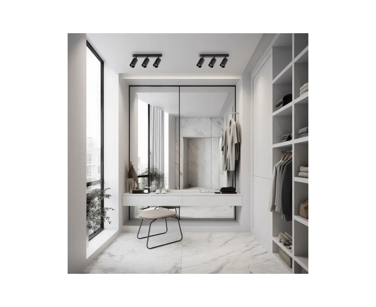 თანამედროვე და მრავალმხრივი სპოტი გლუვი, შავი საფარით. სამი რეგულირებადი პროჟექტორი საშუალებას გაძლევთ მიმართოთ შუქი იქ, სადაც ყველაზე მეტად გჭირდებათ, რაც შესანიშნავს ხდის ოთახის კონკრეტული უბნების ხაზგასმას. მინიმალისტური დიზაინი და სუფთა ხაზები ამ ყურადღების ცენტრში აქცევს ელეგანტურ და ფუნქციურ დანამატს ნებისმიერი სახლის ან კომერციული სივრცისთვის.