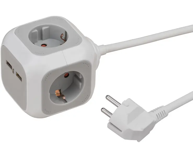 ALEA-Power სოკეტის კუბი ორი USB დამუხტვის სოკეტით, 1,4 მ კაბელის სიგრძით და ოთხი დამცავი კონტაქტური სოკეტით შესანიშნავია, როგორც მოქნილი და სივრცის დამზოგავი ენერგიის წყარო სახლში ან თუნდაც მოგზაურობის დროს (შემაერთებელი სისტემის ტიპი E და F).