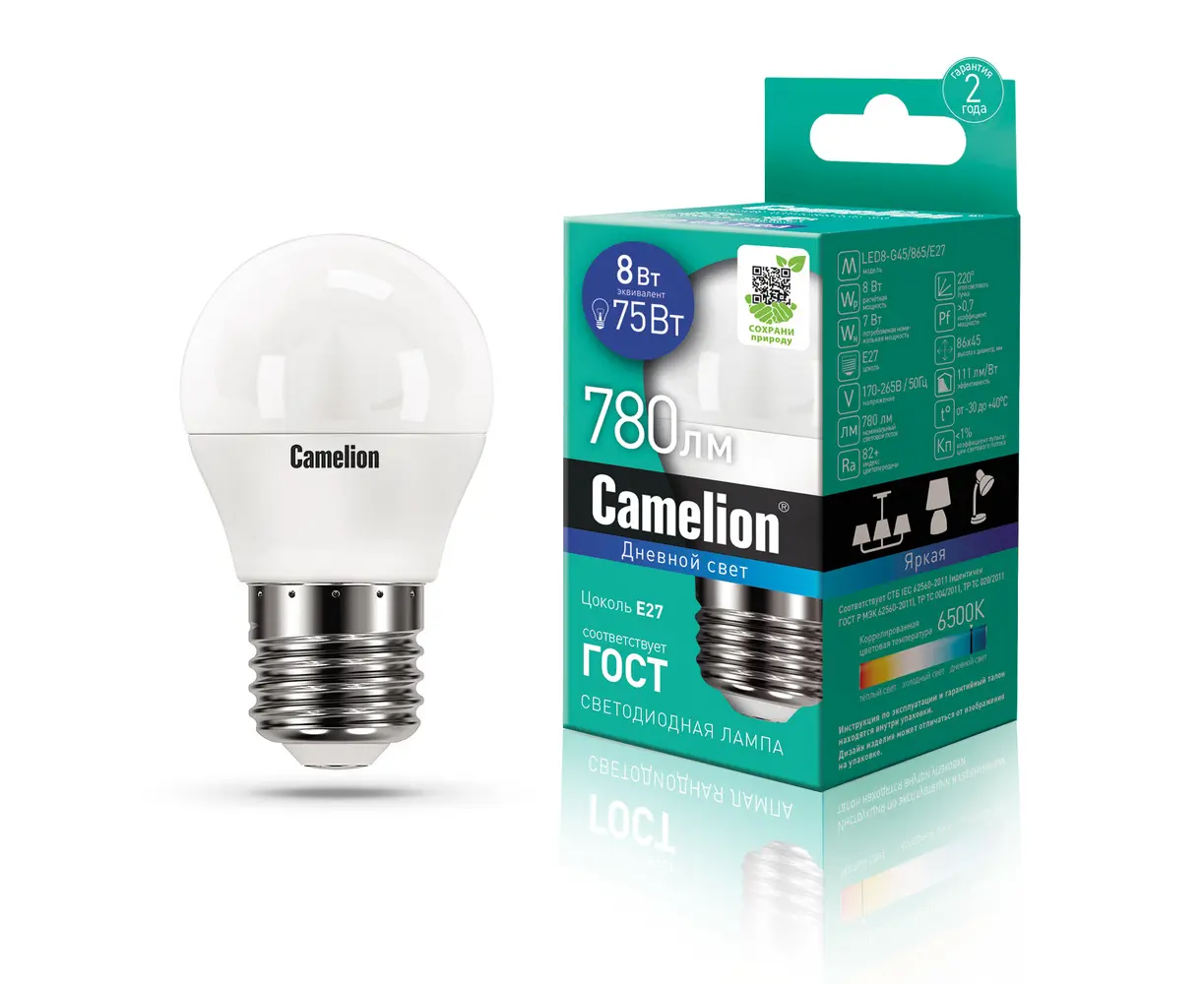 შუქდიოდური ნათურა Camelion 8W G45 Е27 6500K