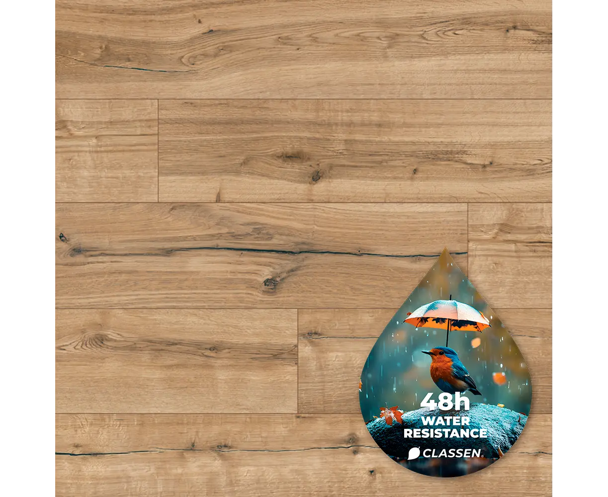Classen არის გერმანული კომპანია, რომელიც აწარმოებს მაღალხარისხიან ლამინატს. კოლექცია მდგრადია დაყენებული წყლის მიმართ 24 საათის განმავლობაში.