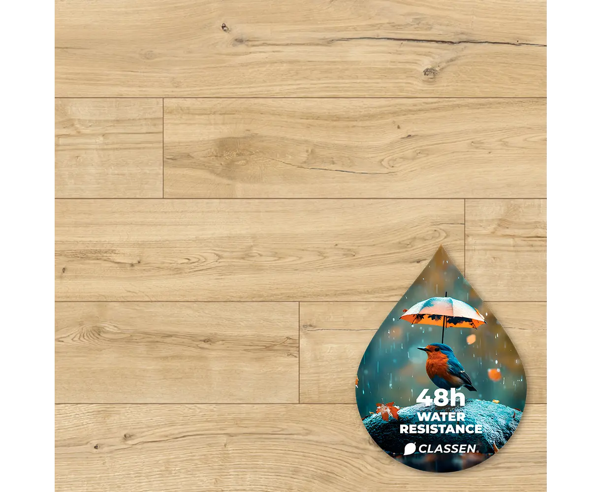 Classen არის გერმანული კომპანია, რომელიც აწარმოებს მაღალხარისხიან ლამინატს. კოლექცია მდგრადია დაყენებული წყლის მიმართ 24 საათის განმავლობაში.