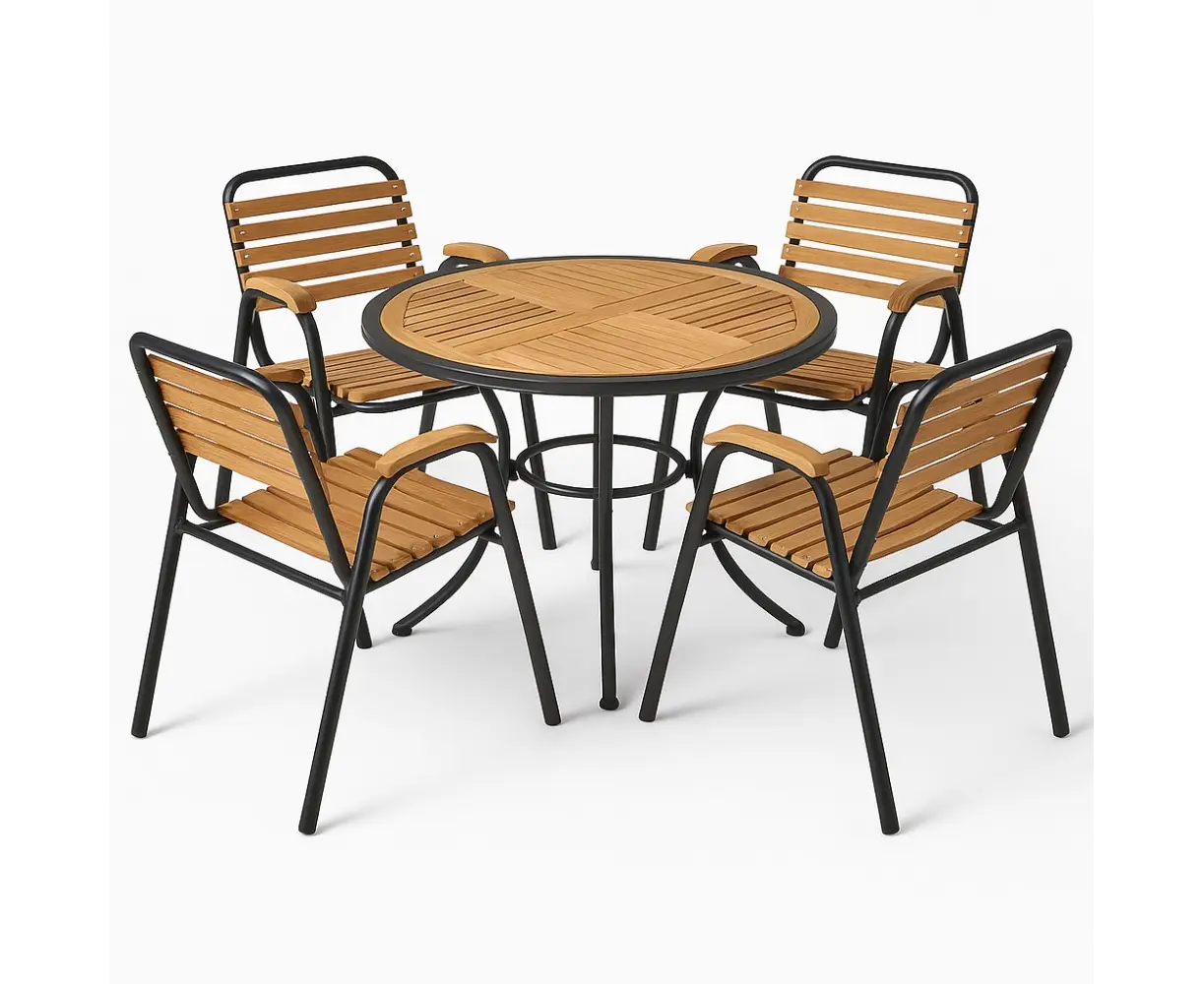 ავეჯის კომპლექტი მოიცავს მრგვალ მაგიდასა და 4 კომფორტულ სკამს, რაც იდეალურია როგორც ეზოსთვის, ტერასისთვის, ისე კაფისა და ბარის ღია სივრცეებისთვის. ლითონის ძლიერი ჩარჩო და ხისფერი ზედაპირი აერთიანებს გამძლეობას და ბუნებრივ ესთეტიკას, რაც ინტერიერსა და ექსტერიერს დახვეწილ იერს სძენს.