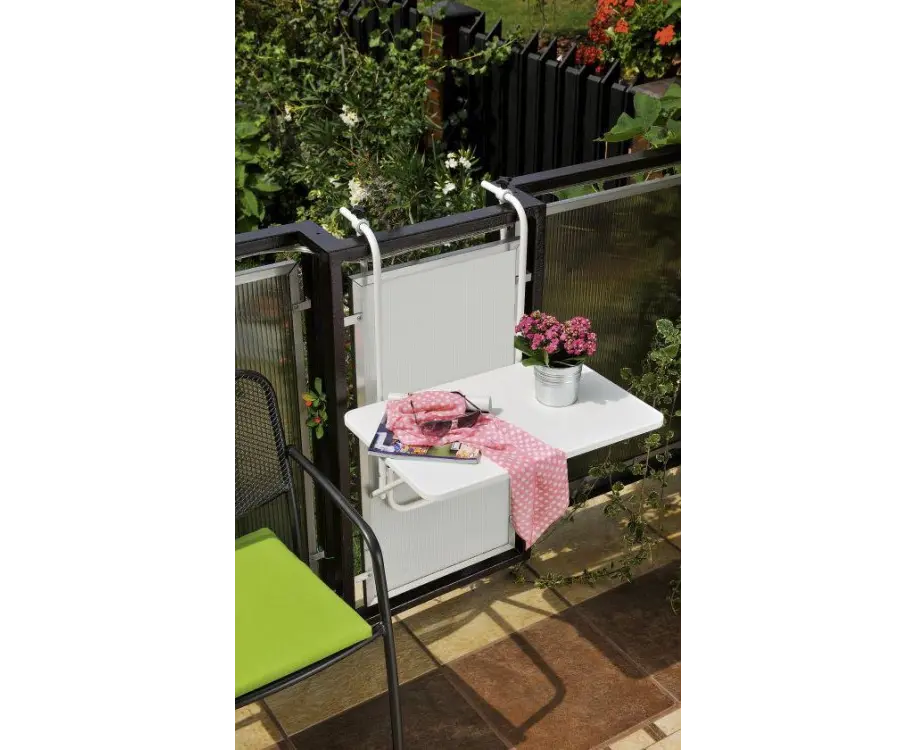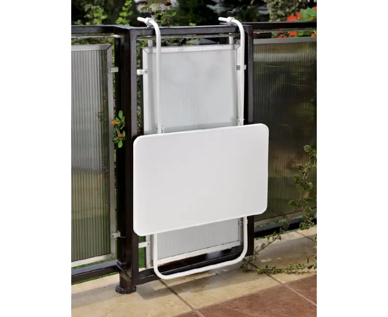 აივნის გასაშლელი მაგიდა, იკეცება, იდეალურია მცირე აივნებისთვის. მაგრდება მოაჯირზე რეგულირებადი კაუჭებით.