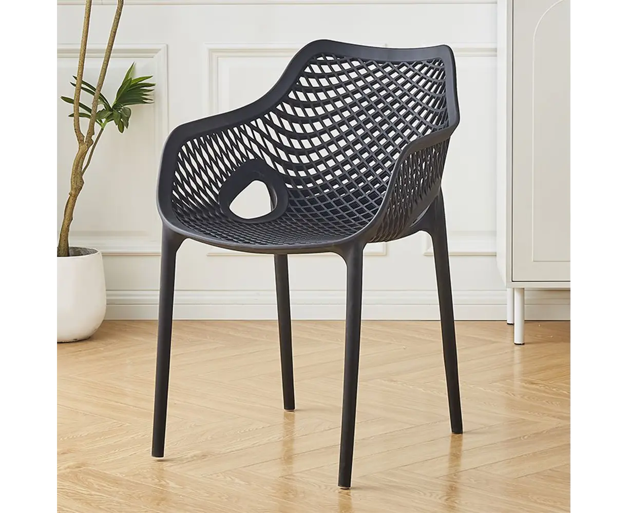სკამი გამოირჩევა თანამედროვე ელეგანტურობითა და დახვეწილი დიზაინით. მისი უნიკალური ბადისებრი საზურგე არამხოლოდ ესთეტიკურ ეფექტს ქმნის, არამედ უზრუნველყოფს კომფორტულ და ერგონომიულ საყრდენს ჯდომისას. დამზადებულია მაღალი ხარისხის პოლიპროპილენის პლასტმასისგან, რაც სკამს მსუბუქს, თუმცა გამძლესა და ამინდისადმი მდგრადს ხდის. მისი მყარი კონსტრუქცია და სტაბილური ფეხები იდეალურია როგორც შიდა, ისე გარე სივრცეებისთვის – იქნება ეს ბაღი, ტერასა, რესტორანი თუ თანამედროვე სახლის ინტერიერი. ეს სკამი შესანიშნავი არჩევანია მათთვის, ვინც ეძებს ფუნქციურობას, სტილსა და გამძლეობას ერთ დიზაინში.