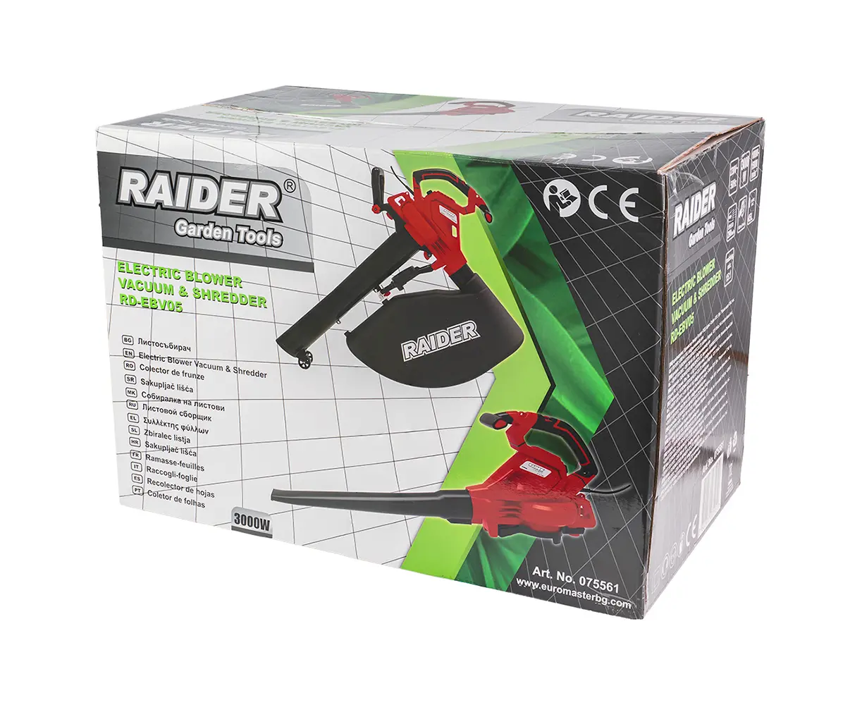 Raider RD-EBV05 ელექტრო ჰაერსაბერი არის მაღალი შესრულების ხელსაწყო, რომელიც განკუთვნილია ეფექტური გასუფთავებისა და ჰაერის მოძრაობისათვის sowohl საცხოვრებელ, ასევე კომერციულ გარემოში. მოწყობილობა აღჭურვილია 3000W ძრავით, რომელიც მუშაობს 230 V-ით და უზრუნველყოფს 150 m³/წთ ჰაერის ნაკადს და 320 km/სთ ჰაერის სიჩქარეს. უქმ მდგომარეობაში მისი ბრუნვის სიჩქარე მოიცავს 10,000-დან 15,000 ბრ/წთ-მდე, რაც უზრუნველყოფს სწრაფ და ეფექტურ ჰაერის გადაადგილებას. აქვს 45 ლიტრიანი ჩანთა, რაც ხელს უწყობს ნარჩენი მტვრის შეგროვებას და მოსარგებლობას მარტივს ხდის. გამდიდრული შავი/წითელი დიზაინი უზრუნველყოფს სტილუს და სანდოობას, რაც ამ ხელსაწყოს იდეალურს ხდის სხვადასხვა გაწმენდის ამოცანებისთვის.