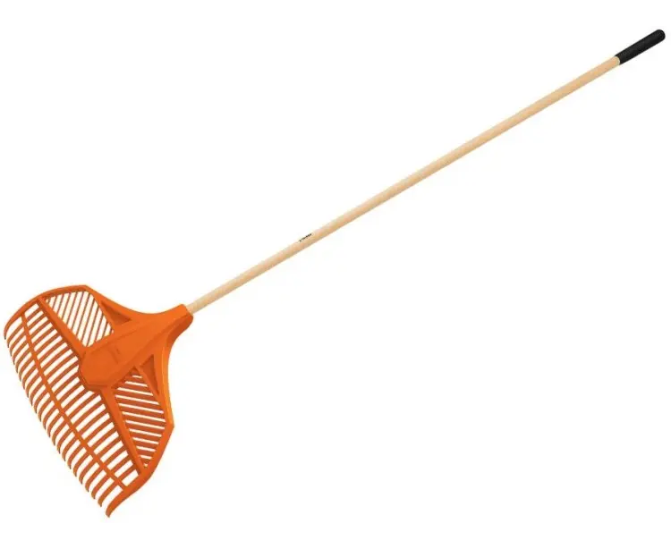 ფოცხი იდეალურია ფოთლების შესაგროვებლად. ელასტიური პოლიპროპილენის კბილანები და ხის ტარი.